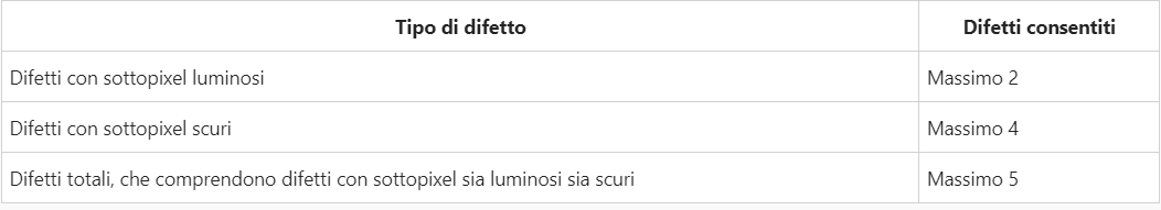 Difetti di pixel e sottopixel: durante i primi 12 mesi coperti da garanzia, FEC ITALIA garantisce la sostituzione del display anche nel caso di un unico pixel non funzionante. Dopo tale periodo sono applicati i criteri elencati di seguito: