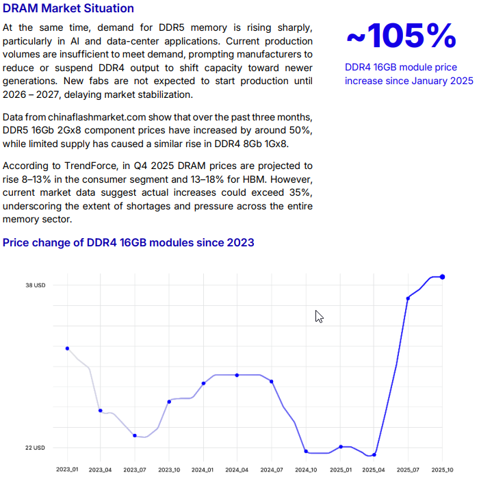 I prezzi dei moduli DDR4 16 GB sono aumentati di oltre 105% da gennaio 2025